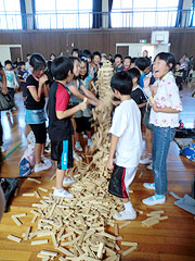 「あ~あ」と、ため息つきながらも、また、誰ともなく積み始めました。本当に不思議な魅力を持つ木の板で、自由な発想、集中力と創造力の遊びで、木の感触がとても心地よいのです。