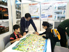 当日は、パートナーグループの活動報告や交流会があり、展示コーナーには66団体の出展がありました。 三重県の県土整備部が出展した土砂災害実験では、職員の手作り模型によって、土砂くずれのときに擁壁(ようへき)がどのような役割を果たすかがよくわかるように工夫されており、子どもたちから(私も)、思わず「オー!」という驚きの声があがっていました。また、防災管理部のコーナーでは、防災双六(すごろく)を楽しむ子どもの姿もありました。