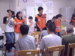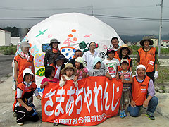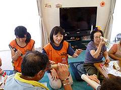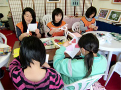 そして、4月27日~30日、みえ災害ボランティア支援センターによる岩手県山田町のボランティア活動に「こころネット」として参加しました。「メッセージカードづくり」「プラバンキーホルダーづくり」「刺し子ふきん」「伊勢型紙」のメニューを準備し、子どもも大人も楽しめる「わくわく広場」を開催しました。
