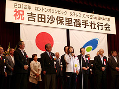 2012ロンドンオリンピック女子レスリング55kg級日本代表の吉田沙保里選手壮行会が津市センターパレスで開催されました。大勢の皆さんから応援メッセージの後、本人からは「オリンピック3連覇をめざす」と力強い決意表明がありました。大変なプレッシャーを超えがんばれるよう、みんなで応援しましょう!!!