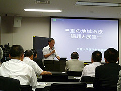 三重大学医学部附属病院 竹田 寛病院長から、「三重の地域医療―課題と展望―」と題してご講演いただき、みえの地域医療を再生するために、「総合診療医(総合医)を増やすこと」「総合的な診療もできる内科医を増やすこと」等の医師養成方針や、三重県地域医療再生計画における「医療従事者の確保」「地域連携体制の構築」「救急、災害、心筋梗塞、脳卒中、周産期・小児、がん等の事業」等の取り組み内容をお話いただきました。