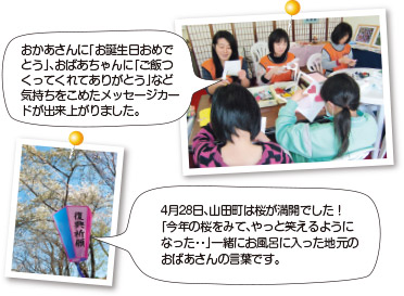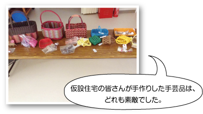 - 仮設住宅では、みんなで畑をつくったり、手芸品を作ったりして励ましあって暮らしている。