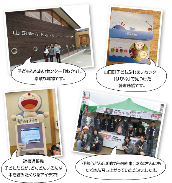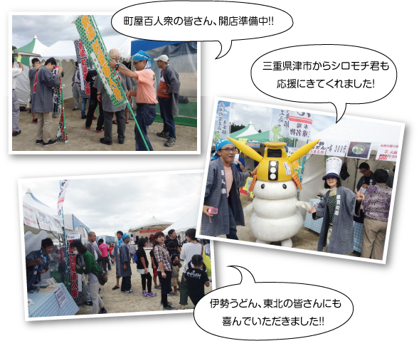 夜行バスで東京上野駅を出発し、朝8時に、山田町道の駅に到着。夜8時まで12時間の活動ですが、町屋百人衆や三重大生の皆さんと、今年も精一杯、伊勢うどんを販売します。さまざまな出会いの始まりです。