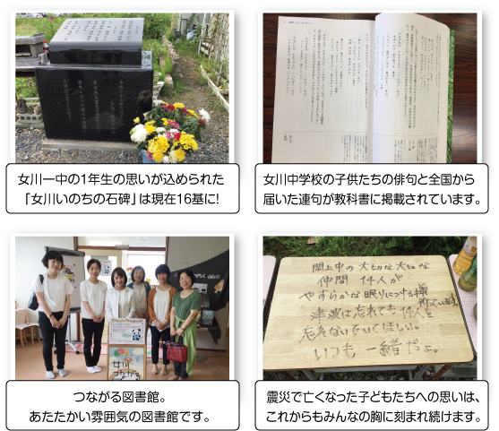 その後、子どもたちは高校生になってからも、108回の会合を持ち、取り組みを続け、「女川いのちの石碑」を建立し(現在16基)、「女川いのちの教科書」をつくりあげました。
