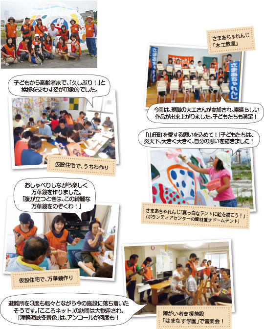 「こころネット」(代表:杉本ゆや)は、子どもたちの夏休みにあわせて、8月2日〜5日に、再び山田町を訪れました。山田町社会福祉協議会から依頼をうけ、「さまあちゃれんじ」(夏休み子ども教室)に参加したり、仮設住宅や障がい者支援施設を訪問しました。これからも被災地を見守り続け、「できる支援をできるだけ」していきたいと思います。